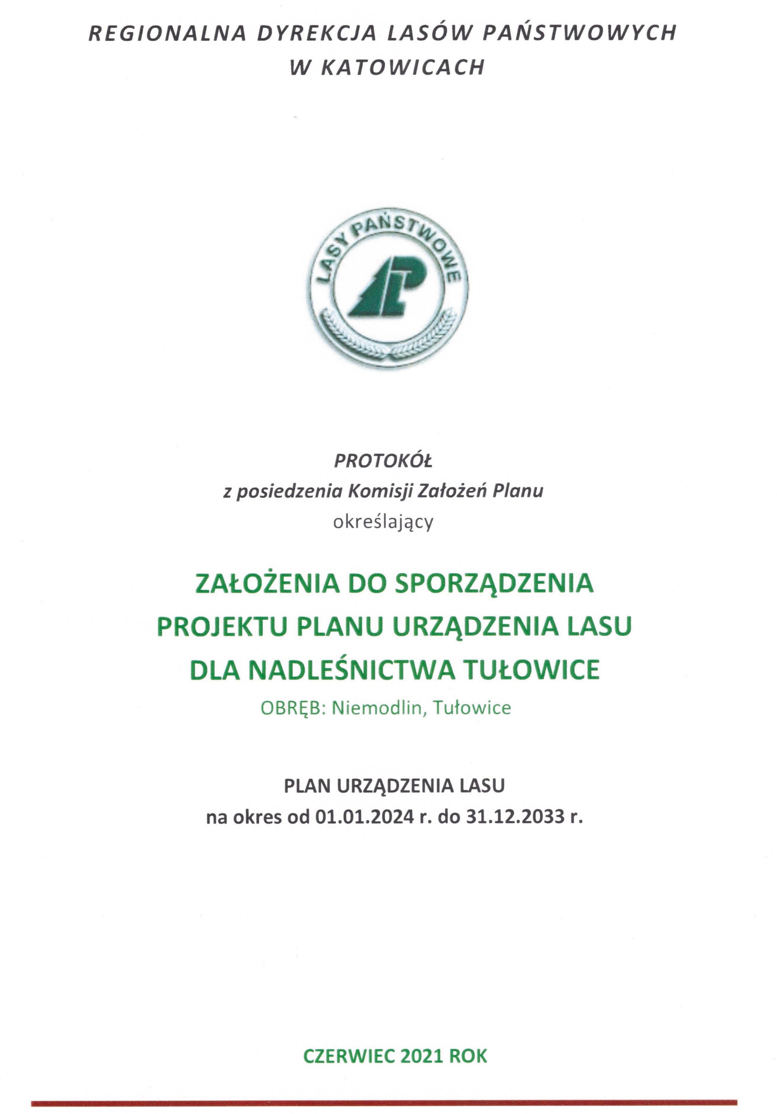 Dyrektor Regionalnej Dyrekcji Lasów Państwowych w Katowicach zawiadamia, iż w dniach od 12 lipca 2021 roku do 1 sierpnia 2021 roku zostanie wyłożony do konsultacji społecznych protokół Komisji Założeń Planu do projektu Planu Urządzenia Lasu Nadleśnictwa na lata 2024-2033 opracowywanego wg stanu na 01.01.2024 r. dla Nadleśnictwa Tułowice.